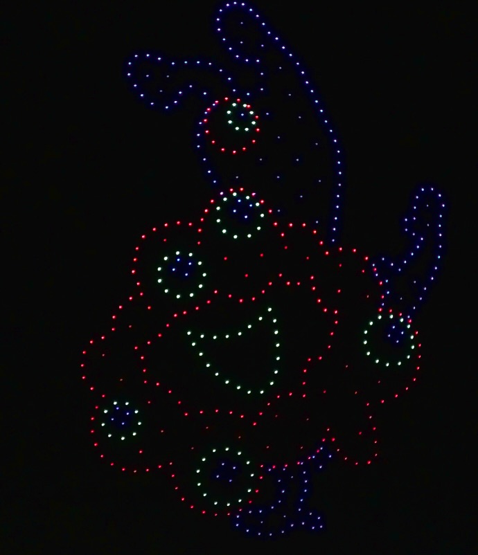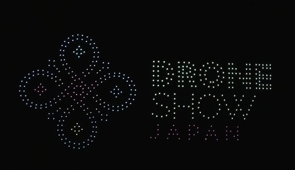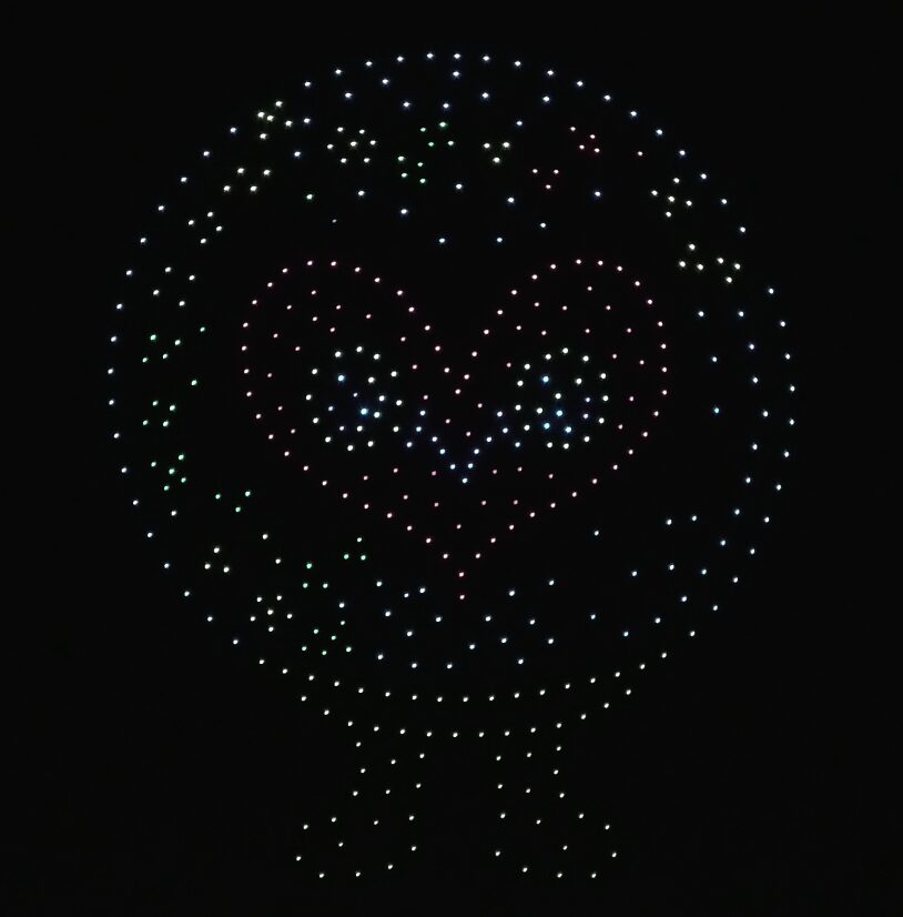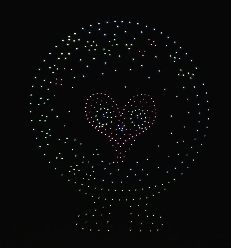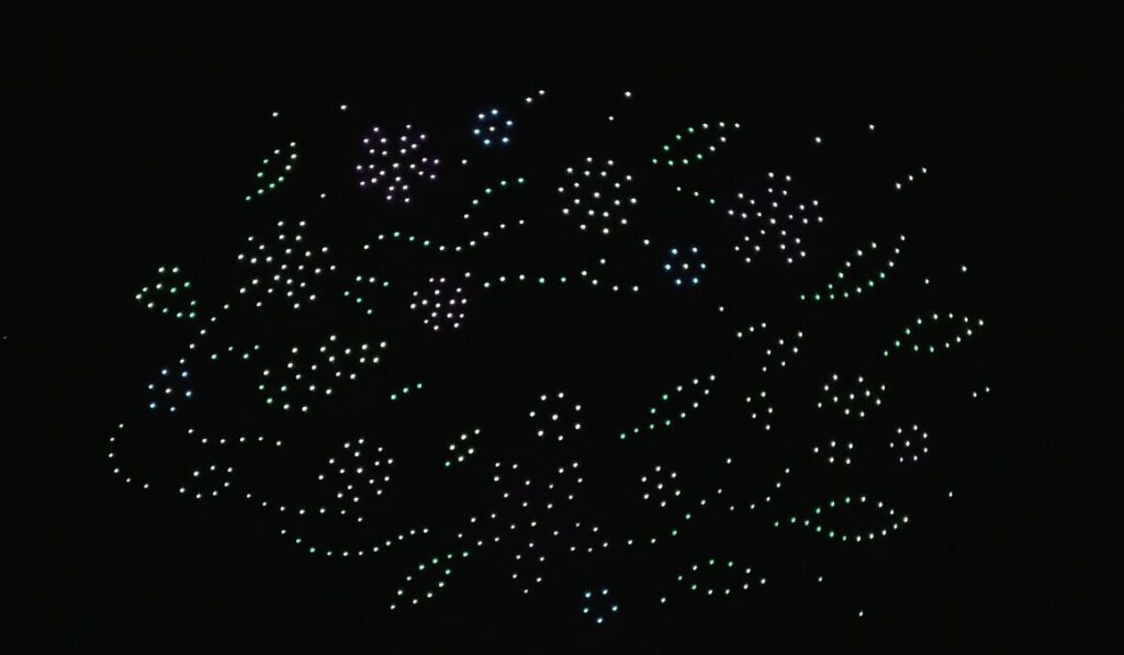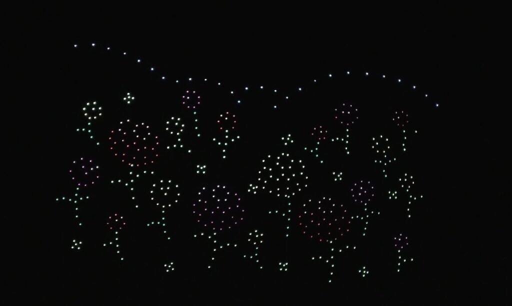 開始予定は19:00でしたが、実際のスタートは19:15頃。約15分間にわたってドローンショーが行われました。