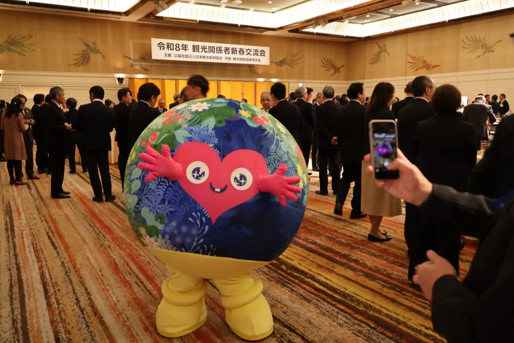 14日夕刻からは当協会主催、観光関連団体22団体との共催で、「令和8年観光関係者新春交流会」を開催、2027年国際園芸博覧会の公式マスコットキャラクター「トゥンクトゥンク」もPRに駆けつけご参加者の皆様をお迎えし、和やかな雰囲気のもと、会が行われました。