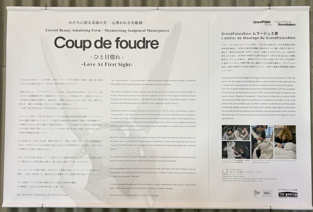 「Coup de foudre = ひと目惚れ」展は、フランスの文化遺産と卓越した職人技を体現する15点の彫刻を通じて、その美と精神を紹介するものです。 本展に並ぶのは、フランスの GrandPalais Rmn(RMN-Grand Palais) ムラージュ工房が手がける複製彫刻の中から厳選されたコレクションです。普段はヨーロッパを代表する美術館に所蔵され、通常は館外に出ることのない名品の数々が、国家認定職人によって精緻に再現され、この度『THE MOVEUM YOKOHAMA』に展示されることになりました。 ムラージュ工房は1794年に始まるルーヴル美術館の技術的系譜を継承し、オリジナル作品の厳密な調査に基づいて、その造形と表面特性を高精度に再現する専門機関です。 今回展示する作品群は、伝統的な技法とデジタル技術などの革新的な技術を融合させた独自の制作工程によって、オリジナル作品の意匠を忠実に尊重し命を吹き込まれた複製彫刻です。 本展では、2025年大阪・関西万博フランス館で展示されていた大型複製彫刻4点に加え、古代ギリシャから20世紀の近代に至る代表的作品11点を合わせた計15点が、会期中に入れ替わり展示されます。 また、その匠の技に呼応する形で、トヨタの最新の廃材アップサイクル技術を活用して制作された大理石風の台座も一部の作品の展示に使用されています。 プシュケとアモルの神話、古代ギリシャ神像の気品、モディリアーニの洗練された造形──名品との出会いは、観る者の心に電撃のような感動を呼び覚ますことでしょう。 “ひと目惚れ”という言葉に象徴される、芸術との鮮烈な邂逅。その瞬間が、あなたを永遠の美の旅へと誘います。