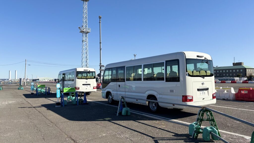 モビリティ「e-palette」もしくはマイクロバス「COASTER」が頻繁に出ているので、少し並んでもスムーズに会場へと向かうことができました。モビリティは定員(10名程度)が少ないので、並びたくない方はマイクロバスがおすすめです。