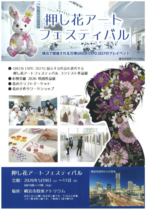 花々の美しさをそのまま閉じ込めた「押し花アート」の魅力を体感できるアートイベント「押し花アートフェスティバル」が、2026年5月9日から横浜市役所アトリウムで開催されます。 GREEN×EXPO 2027 に展示される作品の先行発表や特別展示、ワークショップなど、花と芸術を楽しめる内容がそろいます。