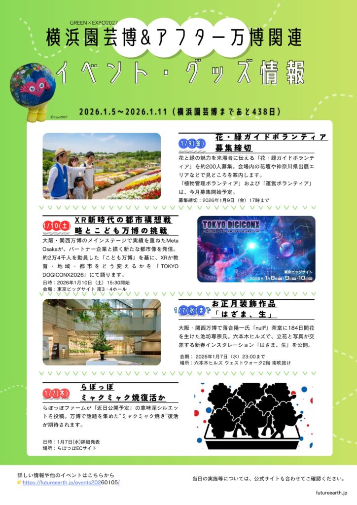 2026.01.04 イベント 今週のイベント(2026.1.5〜2026.1.11)|横浜園芸博&アフター万博関連 mirai Contents 今週のイベント(2026.1.5〜2026.1.11)|横浜園芸博&アフター万博関連主なイベント申込が必要なイベントグッズ等情報ボランティア募集 2026年1月9日まで!アフター万博リンク付カレンダー(2026.1.5〜2026.1.11)今週のイベント(2026.1.5〜2026.1.11)|横浜園芸博&アフター万博関連 横浜園芸博&アフター万博関連20260105ダウンロード 主なイベント GREEN×EXPO 2027で使われる横浜市ユニフォーム再生プロジェクト 申込が必要なイベント 2026年1月31日(土)学生発・フードロス体験ツアー開催|市川で学ぶ「もったいない」とGREEN×EXPO 2027 グッズ等情報 12月22日(月)黒トゥンクトゥンクグッズがまさかの登場! 12月17日(水)から 「花束持ちトゥンクトゥンク」新作登場!12月17日発売開始 GREEN×EXPO 2027仕様マイナンバーカードケースが登場 ボランティア募集 2026年1月9日まで! 11月17日(月)~1月9日(金)花・緑ガイドボランティア募集開始 アフター万博 1月8日(木)〜1月10日(土)トウキョウデジコンクス2026開催|XR・メタバース・AIの総合展示会と「こども万博」特別セッション リンク付カレンダー(2026.1.5〜2026.1.11) GREENEXPO2027今週のイベント20260105ダウンロード #EXPO2027#GREEN×EXPO2027#イベント#横浜万博#横浜園芸博 ABOUT ME ミライX地球のミライについて考える個人サイト。大阪・関西万博やGREEN×EXPO(横浜万博)を応援しています。