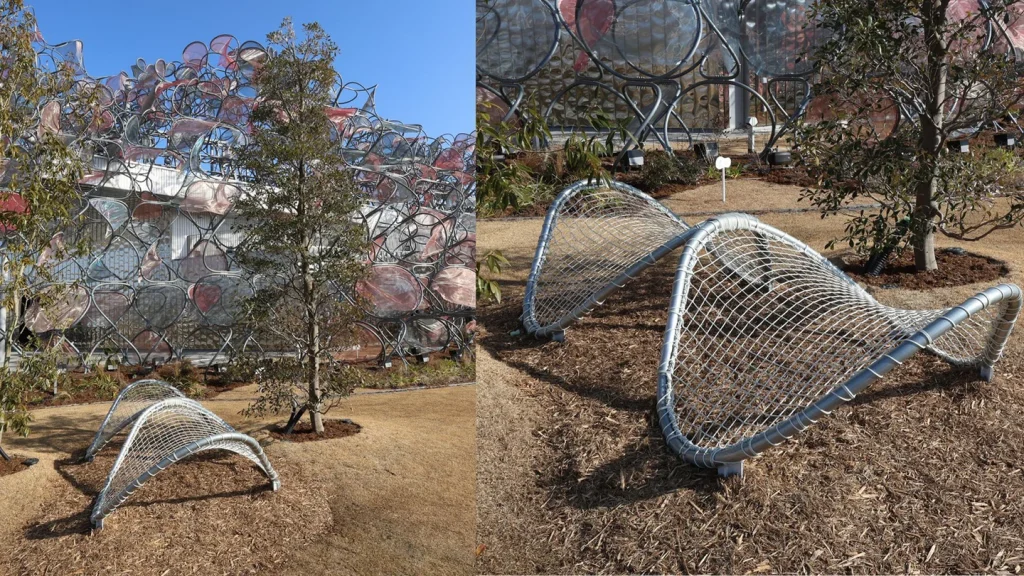 今回のハンモックベンチを含む展示物も、空港・自治体・学校・公共施設などへと移設され、「ノモの国」で提示された循環の思想が都市や日常の風景の中で生き続けるかたちとなりました。
