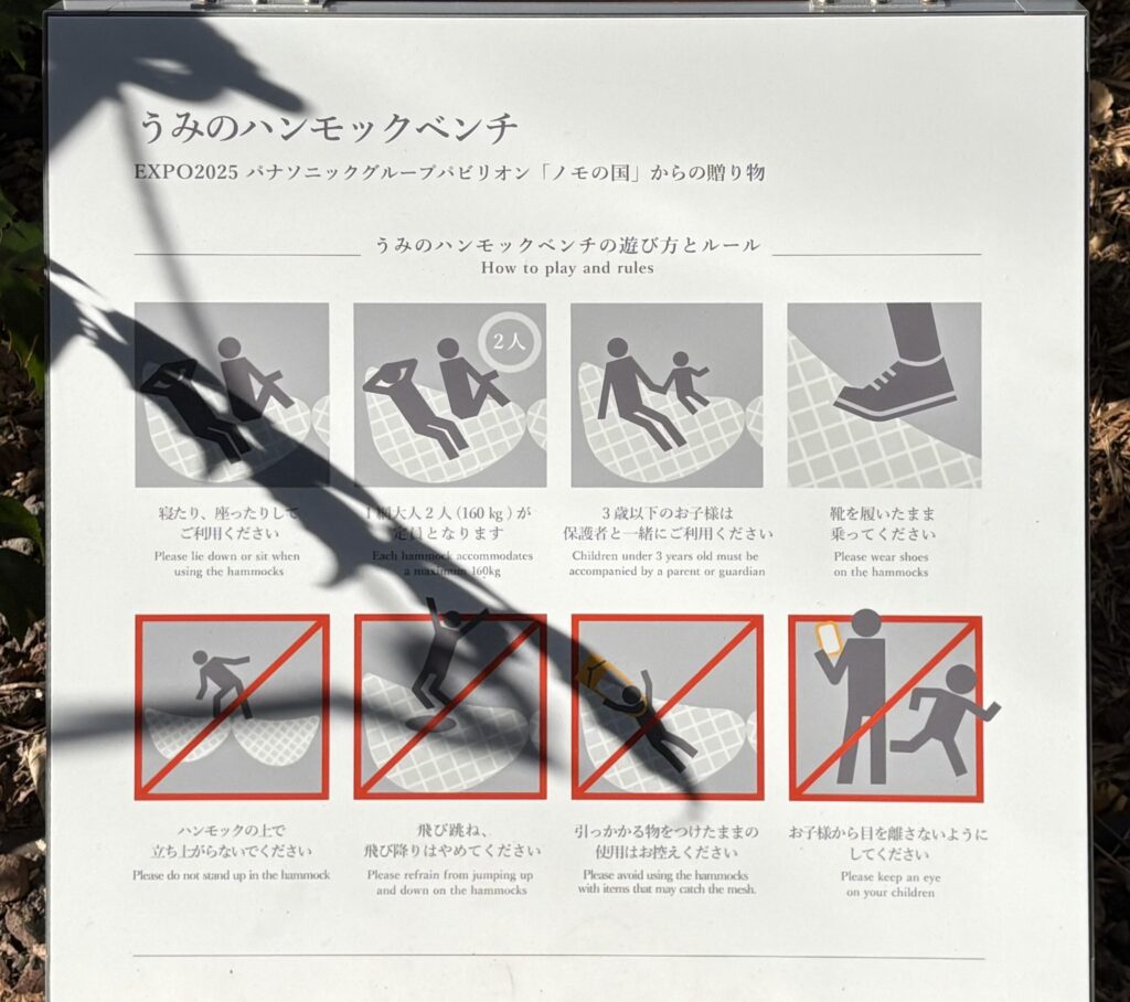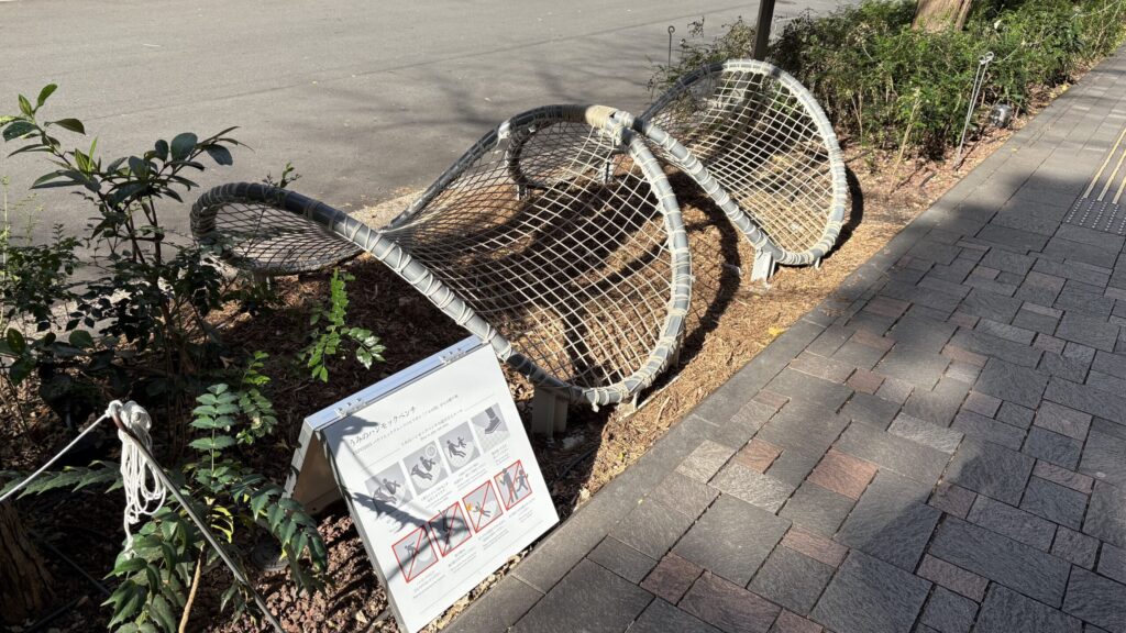 うみのハンモックベンチは、EXPO2025 パナソニックグループパビリオン「ノモの国」からの贈り物として設置された体験型ベンチです。ハンモックベンチは丸の内永楽ビル付近に2個設置してあります。