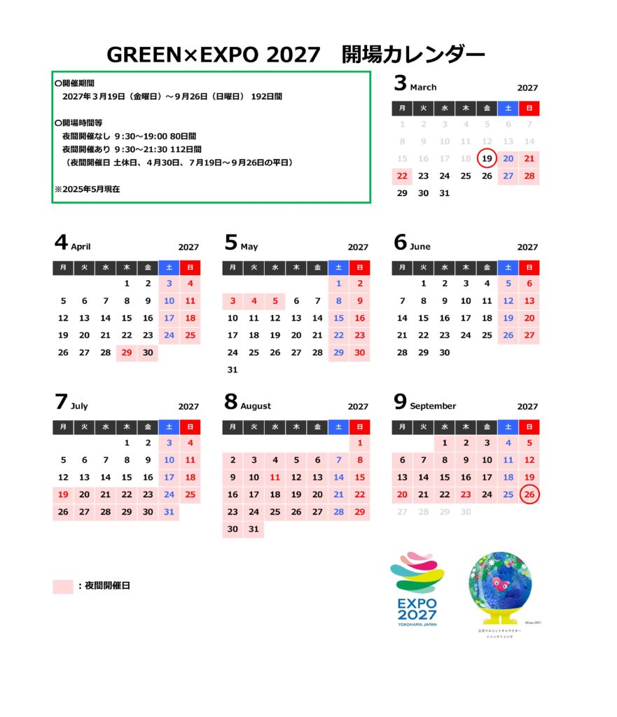 2027年に横浜で開催される「GREEN×EXPO 2027(2027年国際園芸博覧会)」は、入場時間や閉場時間が大阪・関西万博(2025)とは大きく異なります。