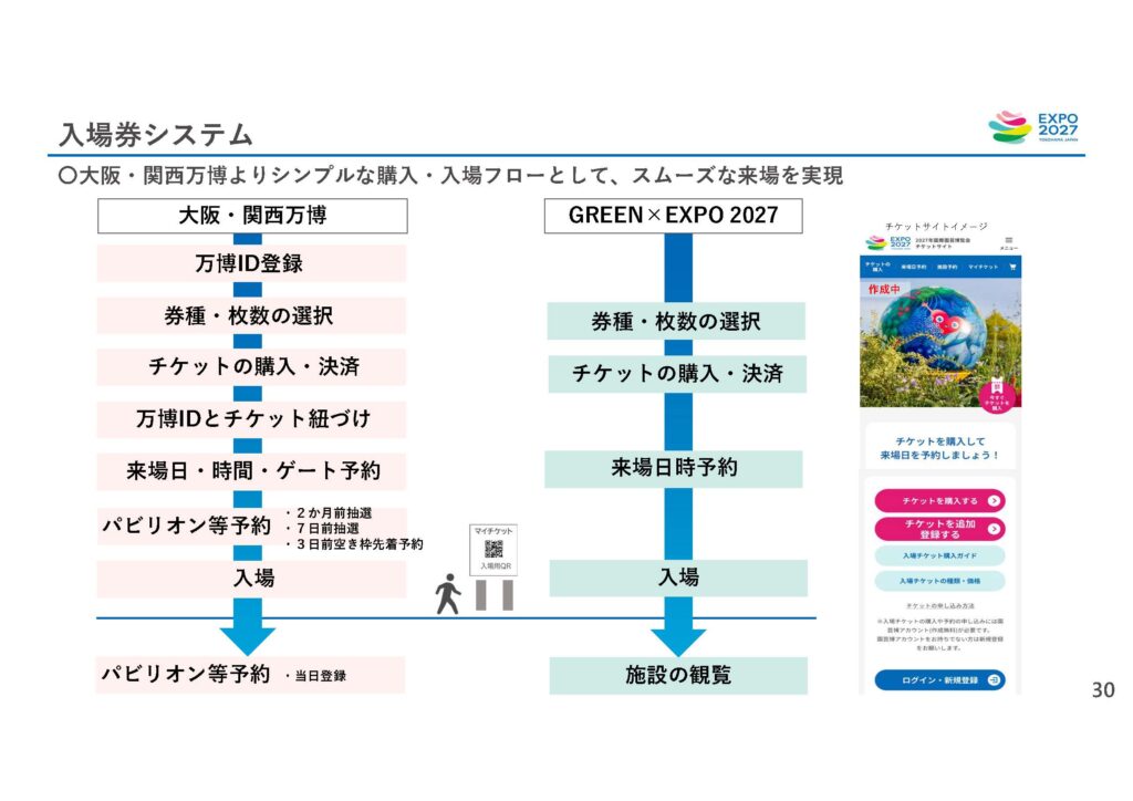 GREEN×EXPO 2027(2027年国際園芸博覧会)では、入場チケットは大阪・関西万博よりシンプルになる一方で、パビリオン体験の予約は「館ごとに独自方式」が併存する可能性があります。