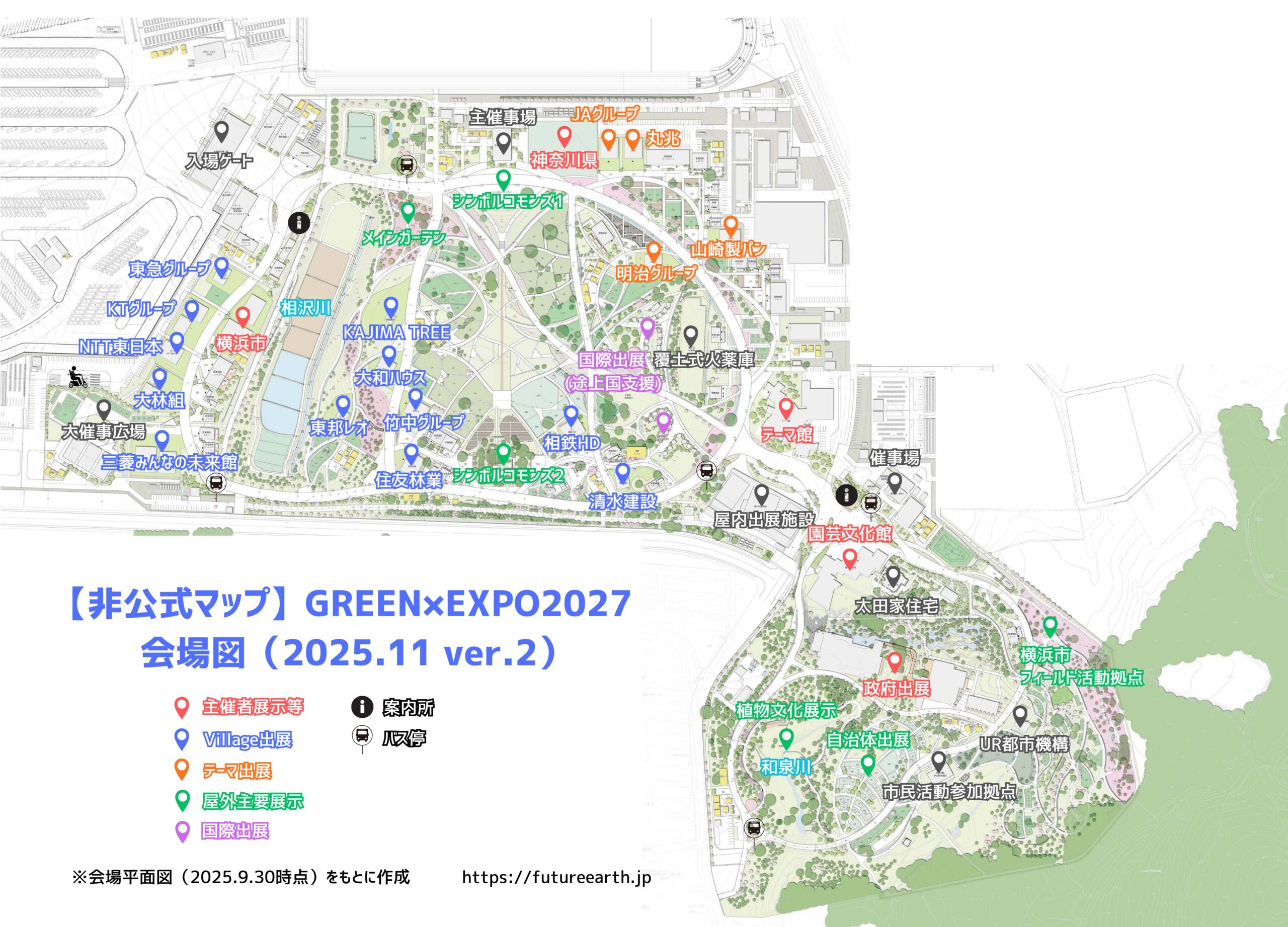2025.9.30時点の会場平面図をもとに、GREEN×EXPO2027(2027年国際園芸博覧会)の非公式マップを作成してみました。会場の様子を思い描くのに見ていただければと思います。