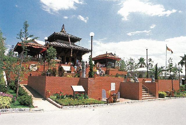 中央の池の周囲にはネパール独自のモニュメントと、クスノキやツツジ類などの植栽が配置され、上段には精巧な彫刻が施されたパゴダと僧侶の宿坊「サタル」、ヒマラヤスギなどの樹木が植えられています。
