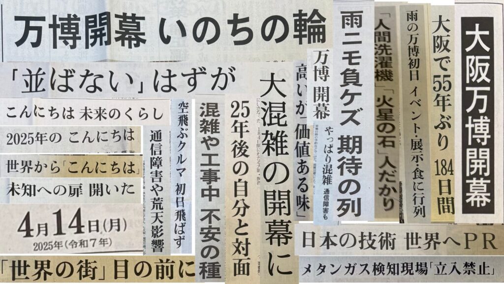 大阪・関西開幕翌日の4月14日、東京の新聞6紙で万博に関連する記事は取っておきました。見ながら懐かしく思い出に浸っています。新聞の見出しは、