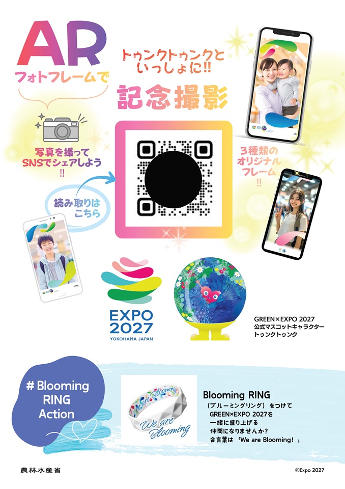 会場では、参加型アートパネルやARフォト体験、ブルーミングアクションなど、子どもから大人まで楽しめる体験型コンテンツを実施。開催1年前の節目に、花とみどりの魅力を体感できるイベントです。