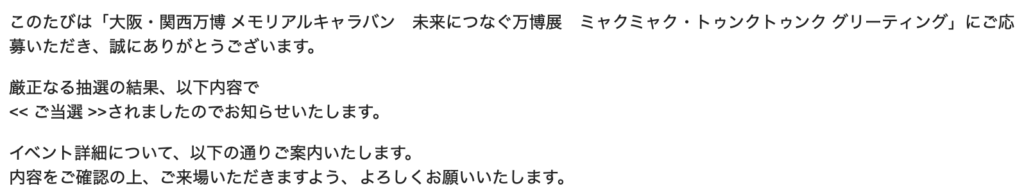 2月16日の15:01に、なんと「未来につなぐ万博展」のミャクミャク&トゥンクトゥンクグリーティング当選メールが来ていました!