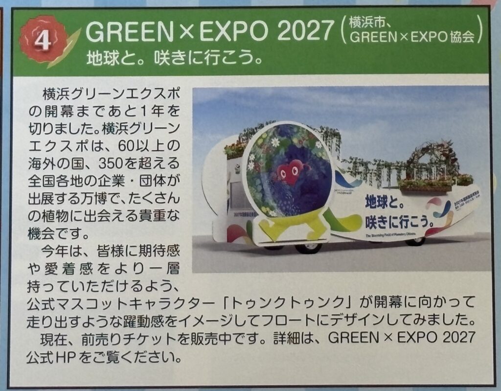 パレードを盛り上げるフロートの一つに、GREEN×EXPO 2027の「トゥンクトゥンク」が描かれたものも登場!「トゥンクトゥンク」が走り出すようなデザインが特徴です。11:15からのスーパーパレードに出演予定です。
