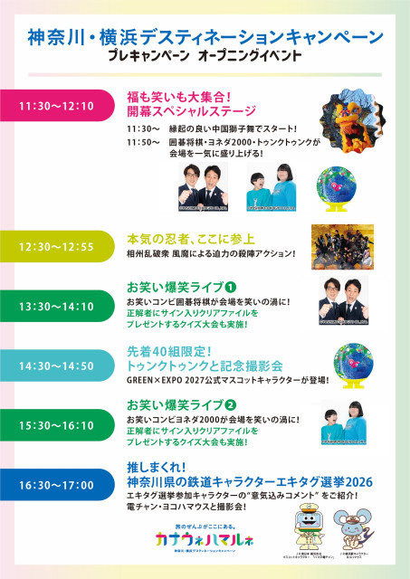 当日は、GREEN×EXPO 2027 の公式マスコットキャラクター・トゥンクトゥンクも登場します。さらに、神奈川県ゆかりの芸人 ヨネダ2000 のステージに加え、神奈川県在住の囲碁将棋(芸人)によるパフォーマンス、さらに、鉄道キャラクターも登場予定です。