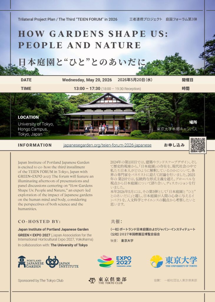 日本国外で最も本格的で美しいと言われるポートランド日本庭園、キャンパス内に国指定文化財(名勝)の日本庭園がある東京大学、そしてGREEN×EXPO 2027の三者が連携し、庭園フォーラム「日本庭園と“ひと”とのあいだに」を開催します。本フォーラムは昨年5月に続く第3弾で、日本庭園が人間の心身に与えるインパクトを、人文科学とサイエンスの観点から考察します。