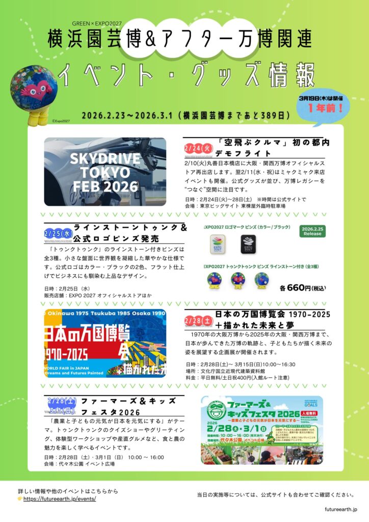 2026.02.23 イベント 今週のイベント(2026.2.23〜2026.3.1)|横浜園芸博・アフター万博関連 mirai 今週のイベント(2026.2.23〜2026.3.1)|横浜園芸博・アフター万博関連 今週の主なイベントをまとめました。3月19日(木)で横浜園芸博の開催までいよいよあと1年。パビリオンや出展の詳細やチケット販売など、続々と情報が出てきそうです! 今週のイベント(2026.2.23〜2026.3.1)|横浜園芸博・アフター万博関連ダウンロード イベント一覧 今後のイベント 1月 20 1月 20 – 3月 3 横浜春節祭2026でランタントゥンクトゥンクを 1月 22 1月 22 – 3月 31 グラン・パレ ムラージュ工房~心奪われる名彫刻達 Coup de foudre -ひと目惚れ-展 1月 31 1月 31 – 5月 6 ミッション∞インフィニティ|宇宙+量子+芸術 2月 3 2月 3 – 3月 29 GREEN×EXPO 2027開催1年前記念イベント|ぼたんちゃんのGREENチャレンジ!~金沢区をめぐるデジタルスタンプラリー~ 2月 16 2月 16 – 3月 22 花やみどりを感じる展示 ~全国都市緑化かわさきフェアと2027年国際園芸博覧会~ 2月 18 2月 18 – 4月 3 「みゃくみゃくとつなぐ展 ~万博とひらく未来~」|日本科学未来館 2月 21 2月 21 – 3月 5 パブリック・アート展「神秘の森」 2月 23 3:20 PM – 4:20 PM Volunteer’s Summit 2026|あきらめていた万博へ、ボランティアとともに ~大阪・関西万博から横浜園芸博へ~ 2月 24 2月 24 @ 8:00 AM – 2月 28 @ 5:00 PM 「空飛ぶクルマ」初の都内デモフライト|東京ビッグサイト 2月 24 7:00 PM – 9:30 PM EXPO企画会議 vol.3 EXPOで「なにか」仕掛けたい学生×応援したい社会人 2月 25 終日 GREEN×EXPO 2027公式ライセンス商品|ラインストーン付き「トゥンクトゥンク」&公式ロゴピンズ全5種が新登場 2月 26 2:00 PM – 5:00 PM 〜BEYOND THE HARVEST〜 横浜農業を「カルチャー」へアップデート 若者×農家でつくる、次世代の『特産品』開発ラボ 2月 28 10:00 AM – 11:20 AM ポケモンピカピカ団 with 横浜市 ごみ拾いイベント 第二弾 2月 28 2月 28 @ 10:00 AM – 3月 1 @ 4:00 PM ファーマーズ&キッズフェスタ 2026|トゥンクトゥンクと遊ぼう! 2月 28 2月 28 @ 10:00 AM – 3月 1 @ 6:00 PM 未来につなぐ万博展|福岡会場 2月 28 2月 28 @ 10:00 AM – 3月 15 @ 4:30 PM 日本の万国博覧会 1970–2025 + 描かれた未来と夢 2月 28 1:30 PM – 3:30 PM 早春の区民コンサート2026|横浜市瀬谷区 2月 28 7:00 PM – 7:05 PM YOKOHAMA NIGHT FLOWERS × GREEN×EXPO 2027 3月 2 3月 2 @ 12:00 PM – 3月 4 @ 6:00 PM Shibuya SDGs STREET Action Blooms 3月 2 5:30 PM – 8:00 PM YOKOHAMA サーキュラーエコノミーplus セッション 2026 ~GREEN×EXPO 2027に向けて横浜瀬谷の地から「学・福・農・商」のつながりを創る~ カレンダーを表示 #GREEN×EXPO2027#イベント#トゥンクトゥンク#大阪・関西万博#横浜園芸博 ABOUT ME ミライX地球のミライについて考える個人サイト。大阪・関西万博やGREEN×EXPO(横浜万博)を応援しています。