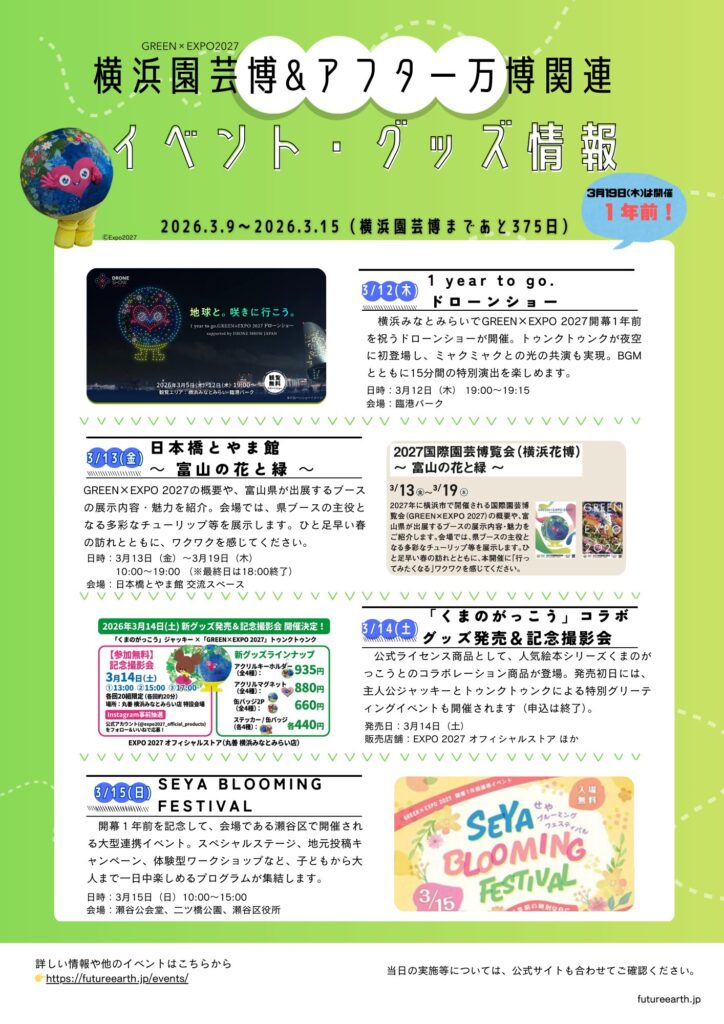 2026.03.08 2026.03.08 イベント 今週のイベント(2026.3.9〜3.15)|横浜園芸博・アフター万博関連 mirai 今週のイベント(2026.3.9〜3.15)|横浜園芸博・アフター万博関連 今週の主なイベントをまとめました。3月19日(木)で横浜園芸博の開催までいよいよあと1年。 今後のイベント 1月 22 1月 22 – 3月 31 グラン・パレ ムラージュ工房~心奪われる名彫刻達 Coup de foudre -ひと目惚れ-展 1月 31 1月 31 – 5月 6 ミッション∞インフィニティ|宇宙+量子+芸術 2月 3 2月 3 – 3月 29 GREEN×EXPO 2027開催1年前記念イベント|ぼたんちゃんのGREENチャレンジ!~金沢区をめぐるデジタルスタンプラリー~ 2月 16 2月 16 – 3月 22 花やみどりを感じる展示 ~全国都市緑化かわさきフェアと2027年国際園芸博覧会~ 2月 18 2月 18 – 4月 13 「みゃくみゃくとつなぐ展 ~万博とひらく未来~」|日本科学未来館 2月 28 2月 28 @ 10:00 AM – 3月 15 @ 4:30 PM 日本の万国博覧会 1970–2025 + 描かれた未来と夢 3月 9 終日 GREEN×EXPO 2027開催1年前記念「オリジナル フレーム切手」発売 3月 10 2:00 AM – 4:00 PM 第4回自然と人間との共生フォーラム 「都市生態系 ~都市に生息する生きものたち~ 」 3月 12 7:00 PM – 7:15 PM 地球と。咲きに行こう。1 year to go. GREEN×EXPO 2027 ドローンショー 3月 13 3月 13 – 3月 19 日本橋とやま館「2027国際園芸博覧会(横浜花博)~ 富山の花と緑 ~」 3月 13 3月 13 – 3月 15 「麦食音祭2026」40カ国が集結!万博閉幕後“初”パビリオン登場|アフターEXPOの国際フェス 3月 13 10:00 AM – 5:30 PM 【申込終了】null²公式長編記録映画「さようなら、ホモサピエンス」上映会 3月 14 終日 「くまのがっこう」とトゥンクトゥンクのコラボグッズ発売&記念撮影会 3月 14 10:00 AM – 3:00 PM 【旭区主催】GREEN×EXPO 2027 開催1年前を地元旭区から盛り上げる「あさひ魅力発信フェスタ」 3月 14 3月 14 @ 10:00 AM – 3月 15 @ 6:00 PM 未来につなぐ万博展|仙台会場 3月 15 10:00 AM – 3:00 PM GREEN×EXPO 2027 開催1年前記念イベント「緑区環境・防災まるごとフェスティバル!」 3月 15 10:00 AM – 3:00 PM 【瀬谷区主催】SEYA BLOOMING FESTIVAL|GREEN×EXPO 2027開催1年前連携イベント 3月 15 1:00 PM – 3:30 PM 【募集終了】泉区GREENバスツアー 3月 16 3月 16 – 3月 19 【農林水産省主催】「消費者の部屋」展示|いよいよ1年後に開催!GREEN×EXPO 2027 (2027年国際園芸博覧会) 3月 18 終日 トゥンクトゥンク新作ぬいぐるみ発売 3月 19 終日 開幕1年前|GREEN×EXPO2027 3月 19 3月 19 – 3月 22 「花の港」イベント|トゥンクトゥンクデザインのオリジナルフラワーバッグも 3月 19 3月 19 – 6月 14 ガーデンネックレス横浜2026 3月 21 7:00 PM – 7:05 PM YOKOHAMA NIGHT FLOWERS × GREEN×EXPO 2027 3月 23 1:00 PM – 4:00 PM ホテレスセミナー in 横浜 カレンダーを表示 #GREEN×EXPO2027#トゥンクトゥンク#横浜園芸博#横浜花博 ABOUT ME ミライX地球のミライについて考える個人サイト。大阪・関西万博やGREEN×EXPO(横浜園芸博)を応援しています。