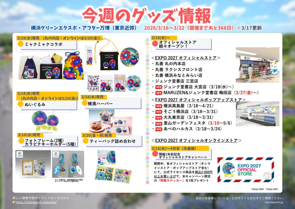 2026.03.14 2026.03.17 イベント 今週のイベント・グッズ情報(2026.3.16〜3.22)|横浜園芸博・アフター万博関連 mirai Contents 今週のイベント・グッズ情報(2026.3.16〜3.22)|横浜園芸博・アフター万博関連1枚で確認!今週のイベント!1枚で確認!今週のグッズ!イベント情報 今週のイベント・グッズ情報(2026.3.16〜3.22)|横浜園芸博・アフター万博関連 今週の主なイベントをまとめました。3月19日(木)で横浜グリーンエクスポの開催までいよいよあと1年! 1枚で確認!今週のイベント! 今週のイベント・グッズ情報(2026.3.16〜3.22)|横浜園芸博・アフター万博関連3ダウンロード 1枚で確認!今週のグッズ! 今週のグッズ情報(2026.3.16〜3.22)_2ダウンロード あわせて読みたい横浜園芸博 開催1年前イベントまとめ あわせて読みたいトゥンクトゥンクグッズはどこで買える?横浜園芸博公式ストアまとめ あわせて読みたい【2026年最新版】トゥンクトゥンク グリーティングイベントまとめ|出演時間・開催場所一覧<2026.4.1更新> イベント情報 今後のイベント 1月 22 1月22日 – 6月28日 グラン・パレ ムラージュ工房~心奪われる名彫刻達 Coup de foudre -ひと目惚れ-展 1月 31 1月31日 – 5月6日 ミッション∞インフィニティ|宇宙+量子+芸術 2月 18 2月18日 – 4月13日 「みゃくみゃくとつなぐ展 ~万博とひらく未来~」|日本科学未来館 3月 19 3月19日 – 6月14日 ガーデンネックレス横浜2026 3月 27 3月27日 – 4月19日 横浜赤レンガ倉庫『FLOWER GARDEN 2026』 3月 28 3月28日 – 9月23日 MoN Takanawa開館記念「ぐるぐる展」で大屋根リング1/200模型を公開 4月 1 4月1日 – 5月17日 横浜赤レンガ倉庫にトゥンクトゥンク巨大モニュメントが登場 4月 3 4月3日 – 4月5日 CENTRAL FIELD(臨港パーク)|トゥンクトゥンクの休憩所が登場 4月 3 4月3日 – 5月10日 2026旭オープンガーデン 4月 4 4月4日 – 4月5日 YOKOHAMA MUSIC HARBOR 2026 4月 4 4月4日 – 5月6日 第48回よこはま花と緑のスプリングフェア2026|山下公園・日本大通り会場 4月 5 7:00 PM – 7:05 PM 横浜ナイトフラワーズ(2026年4月5日)|YOKOHAMA NIGHT FLOWERS × GREEN×EXPO 2027 4月 6 4月6日 – 4月24日 ポルトガル・パビリオン展 4月 7 4月7日 – 4月8日 TEAMZ Summit 2026 4月 10 4月10日 – 5月10日 瀬谷オープンガーデン2026 4月 11 4月11日 – 4月12日 【関東の国営公園5ヵ所】横浜グリーンエクスポのオリジナルグッズを先着配布 4月 11 7:00 AM – 7:05 PM YOKOHAMA NIGHT FLOWERS × GREEN×EXPO 2027 4月 11 10:30 AM – 5:00 PM 神奈川・横浜プレDCオープニングイベント|トゥンクトゥンクも登場! 4月 15 終日 横浜髙島屋に「トゥンクトゥンク」が遊びにくる! 4月 17 4月17日 – 4月19日 東京インフィオラータ2026 4月 17 4月17日 – 4月19日 第14回港北オープンガーデン 4月 18 4月18日 – 5月17日 TOKYOROOMS展 〜40の部屋、40通りの生き方〜 4月 18 4月18日 – 4月19日 東京インフィオラータ2026 4月 18 4月18日 – 4月19日 【関東の国営公園5ヵ所】横浜グリーンエクスポのオリジナルグッズを先着配布 4月 19 終日 ミャクミャク初の写真集『I myaku you.』お渡し会|丸善日本橋店 4月 24 2:00 PM – 4:00 PM 「The Garden of Life」現地説明会 4月 27 7:00 PM – 7:05 PM YOKOHAMA NIGHT FLOWERS × GREEN×EXPO 2027 5月 2 5月2日 @ 10:00 AM – 5月4日 @ 5:00 PM 横浜フラワー&ガーデンフェスティバル2026 5月 8 5月8日 – 5月10日 第14回港北オープンガーデン 5月 9 5月9日 – 5月11日 東京インフィオラータ2026 カレンダーを表示 #EXPO2025#GREEN×EXPO2027#トゥンクトゥンク#ミャクミャク#大阪・関西万博#横浜グリーンエクスポ#横浜園芸博#横浜花博 ABOUT ME ミライX地球のミライについて考える個人サイト。大阪・関西万博やGREEN×EXPO(横浜園芸博)を応援しています。