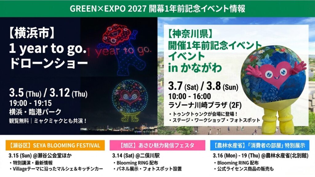 - 【瀬谷区主催】SEYA BLOOMING FESTIVAL|GREEN×EXPO 2027開催1年前連携イベント(3/15)