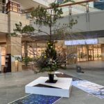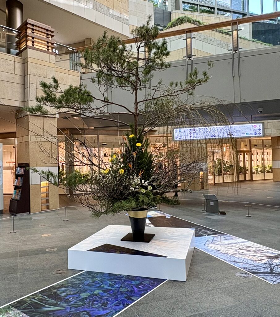 本作は、華道家元池坊麻布橘会支所が主催し、六本木ヒルズの正月装飾として制作されたもの。会場は、六本木ヒルズ ウェストウォーク2階 南吹抜け。開放的な空間に、圧倒的なスケールの立花と写真作品が展開されています。