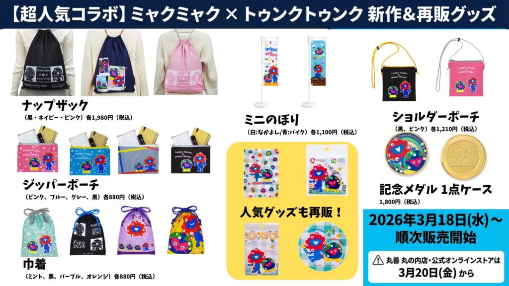 2025年9月に初登場したこのコラボ商品は、「2つの万博をつなぐ夢の共演」として大きな話題を呼び、発売直後から即完売する店舗が続出しました。今回、多くの要望を受けて、新アイテム6種類の追加、人気既存4商品を再販という形でラインナップが大幅に拡充されます。