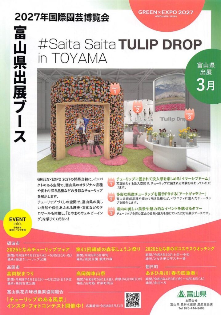 富山県のアンテナショップ日本橋とやま館 交流スペースにて、2026年3月13日(金)〜3月19日(木)の7日間、「2027国際園芸博覧会(横浜花博)~ 富山の花と緑 ~」 が開催中です。