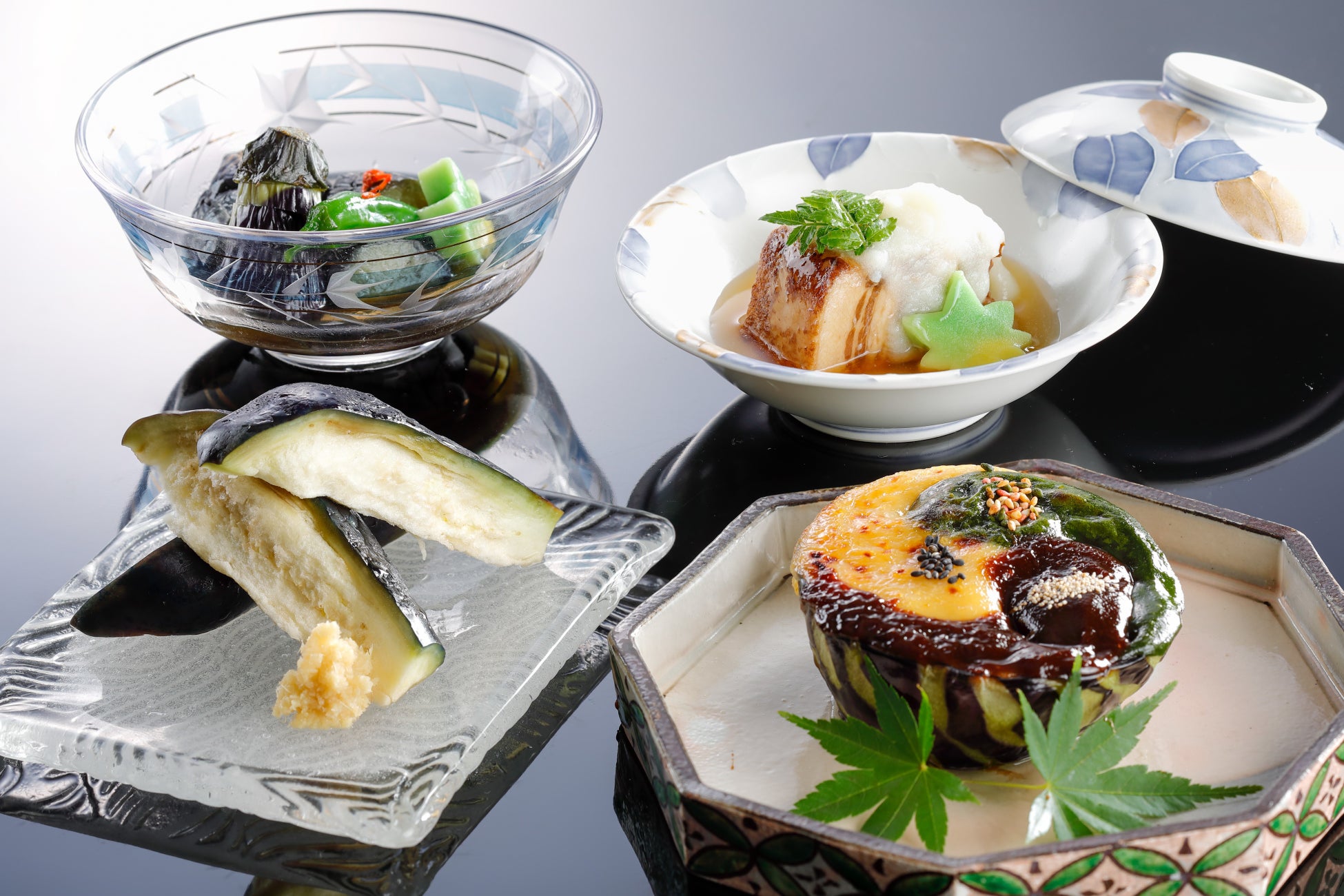 素揚げした茄子を鰹と昆布の出汁で炊き、さっぱりお召し上がりいただけるよう冷やして提供します。油でコクが加わった茄子のとろけるような食感と旨みをお楽しみください。