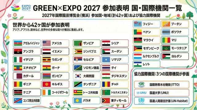 2027年に横浜で開催されるGREEN×EXPO 2027(2027年国際園芸博覧会)のパビリオンは、中心となるテーマ館・園芸文化館・日本政府館のほかに企業・団体出展のパビリオン(village出展・テーマ営業出店)が現在16*ほど決定しています。(*1社辞退のため)