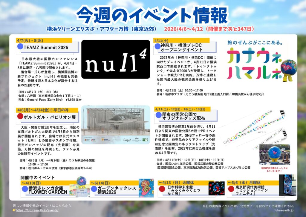 2026.04.05 イベント 今週のイベント・グッズ情報|横浜園芸博・アフター万博関連<2026.4.5更新> mirai Contents 今週のイベント・グッズ情報|横浜園芸博・アフター万博関連<2026.4.5更新>1枚で確認!今週のイベント・グッズ情報!イベント情報過去のイベント・グッズ情報 今週のイベント・グッズ情報|横浜園芸博・アフター万博関連<2026.4.5更新> 1枚で確認!今週のイベント・グッズ情報! 今週のイベント・グッズ情報|横浜園芸博・アフター万博関連<2026.4.5更新>ダウンロード イベント一覧はこちら TEAMZ Summit 2026 ポルトガル・パビリオン展 神奈川・横浜プレDCオープニングイベント|トゥンクトゥンクも登場! 【関東の国営公園5ヵ所】横浜グリーンエクスポのオリジナルグッズを先着配布 ガーデンネックレス横浜2026 横浜赤レンガ倉庫『FLOWER GARDEN 2026』 みゃくみゃくとつなぐ展 ~万博とひらく未来~ ミッション∞インフィニティ|宇宙+量子+芸術 グッズはどこで買える? トゥンクトゥンクに会うには? イベント情報 イベント一覧はこちら 今後のイベント 1月 22 1月22日 – 6月28日 グラン・パレ ムラージュ工房~心奪われる名彫刻達 Coup de foudre -ひと目惚れ-展 1月 31 1月31日 – 5月6日 ミッション∞インフィニティ|宇宙+量子+芸術 2月 18 2月18日 – 4月13日 「みゃくみゃくとつなぐ展 ~万博とひらく未来~」|日本科学未来館 3月 19 3月19日 – 6月14日 ガーデンネックレス横浜2026 3月 27 3月27日 – 4月19日 横浜赤レンガ倉庫『FLOWER GARDEN 2026』 3月 28 3月28日 – 9月23日 MoN Takanawa開館記念「ぐるぐる展」で大屋根リング1/200模型を公開 4月 1 4月1日 – 5月17日 横浜赤レンガ倉庫にトゥンクトゥンク巨大モニュメントが登場 4月 3 4月3日 – 4月5日 CENTRAL FIELD(臨港パーク)|トゥンクトゥンクの休憩所が登場 4月 3 4月3日 – 5月10日 2026旭オープンガーデン 4月 4 4月4日 – 4月5日 YOKOHAMA MUSIC HARBOR 2026 4月 4 4月4日 – 5月6日 第48回よこはま花と緑のスプリングフェア2026|山下公園・日本大通り会場 4月 4 4月4日 @ 10:00 AM – 4月5日 @ 4:00 PM 第48回よこはま花と緑のスプリングフェア2026|横浜公園会場 4月 4 4月4日 @ 11:00 AM – 4月5日 @ 3:00 PM Live!横浜 2026 トゥンクトゥンクグリーティング&PRブースも 4月 4 4月4日 @ 11:00 AM – 4月5日 @ 5:00 PM 蓼科高原バラクライングリッシュガーデンフェア@横浜市役所 4月 5 7:00 PM – 7:05 PM 横浜ナイトフラワーズ(2026年4月5日)|YOKOHAMA NIGHT FLOWERS × GREEN×EXPO 2027 4月 6 4月6日 – 4月24日 ポルトガル・パビリオン展 4月 7 4月7日 – 4月8日 TEAMZ Summit 2026 4月 10 4月10日 – 5月10日 瀬谷オープンガーデン2026 4月 11 4月11日 – 4月12日 【関東の国営公園5ヵ所】横浜グリーンエクスポのオリジナルグッズを先着配布 4月 11 7:00 AM – 7:05 PM YOKOHAMA NIGHT FLOWERS × GREEN×EXPO 2027 4月 11 10:30 AM – 5:00 PM 神奈川・横浜プレDCオープニングイベント|トゥンクトゥンクも登場! 4月 15 終日 横浜髙島屋に「トゥンクトゥンク」が遊びにくる! 4月 17 4月17日 – 4月19日 東京インフィオラータ2026 4月 17 4月17日 – 4月19日 第14回港北オープンガーデン 4月 18 4月18日 – 5月17日 TOKYOROOMS展 〜40の部屋、40通りの生き方〜 4月 18 4月18日 – 4月19日 東京インフィオラータ2026 4月 18 4月18日 – 4月19日 【関東の国営公園5ヵ所】横浜グリーンエクスポのオリジナルグッズを先着配布 4月 19 終日 ミャクミャク初の写真集『I myaku you.』お渡し会|丸善日本橋店 4月 24 2:00 PM – 4:00 PM 「The Garden of Life」現地説明会 4月 27 7:00 PM – 7:05 PM YOKOHAMA NIGHT FLOWERS × GREEN×EXPO 2027 カレンダーを表示 過去のイベント・グッズ情報 今週のイベント・グッズ情報(2026.3.30〜4.5)|横浜園芸博・アフター万博関連ダウンロード 今週のグッズ情報(2026.3.30〜4.5)|横浜園芸博・アフター万博関連ダウンロード #EXPO2025#GREEN×EXPO2027#イベント情報#グッズ情報#トゥンクトゥンク#ミャクミャク#大阪・関西万博#横浜万博#横浜園芸博#横浜花博 ABOUT ME ミライX地球のミライについて考える個人サイト。大阪・関西万博やGREEN×EXPO(横浜園芸博)を応援しています。