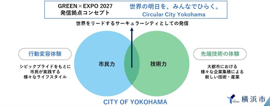 横浜市は、高い市民力と企業の優れた技術力を有する都市です。この市民力と技術力、それぞれが別個に存在・アピールするのではなく、有機的に交じり合わせることが、本市の役割です。この交わりを、市民が実践するこれからのライフスタイルや先端技術が叶える未来のまちや暮らしとして発信します。国を超えて集うEXPOで、人類共通の未来の課題に、横浜らしい新しい「解」が、発信拠点で伝えたいコトになります。